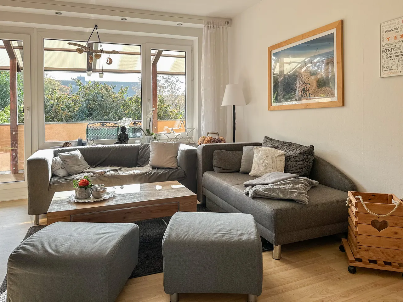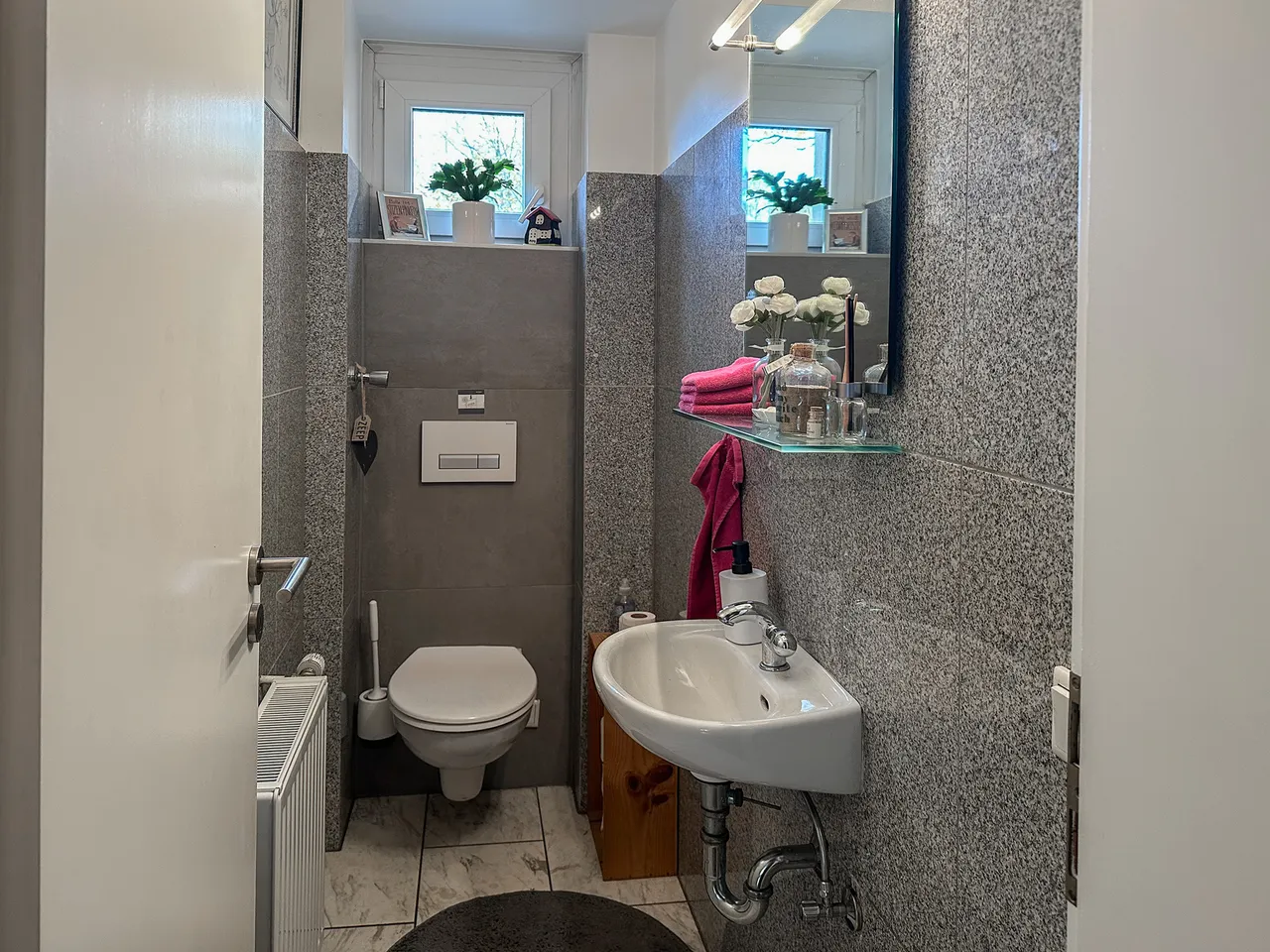 Im Erdgeschoss befindet sich die Hauptwohnung mit großzügigen 120 m². Eine moderne offene Küche, ein Wannen- und Duschbad, Gäste-WC sowie die sonnige Terrasse sorgen für hohen Wohnkomfort.