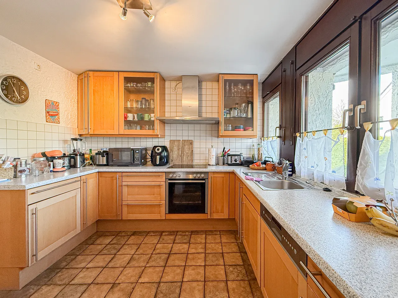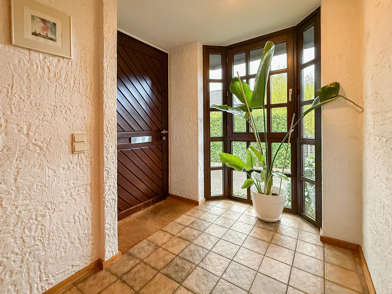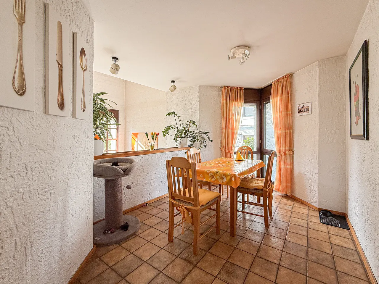 Eingangs- und Wohnebene sind durch eine halbe Treppe getrennt. Ein Kachelofen im Wohnbereich sorgt an kalten Tagen für eine gemütliche Atmosphäre. Küche, offener Essbereich und ein Gäste-WC ergänzen die Eingangsebene. Der Garten liegt zur sonnigen Westseite.