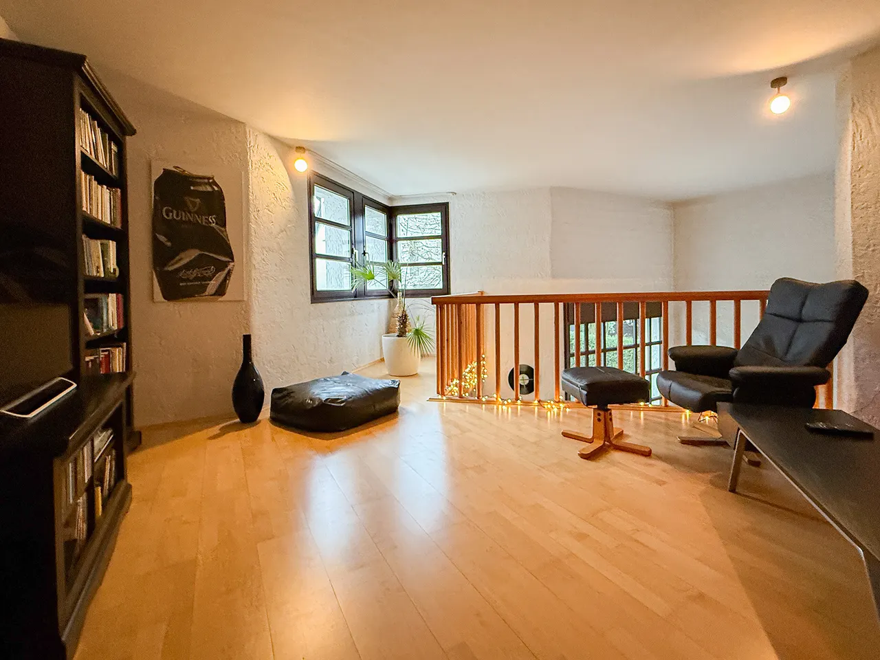 Im Obergeschoss befindet sich die Schlafebene mit zwei Räumen, Bad mit Dusche und Wanne. Eine halbe Treppe tiefer genießen Sie entspannte Stunden auf der Galerie mit Blick in den Wohnbereich.