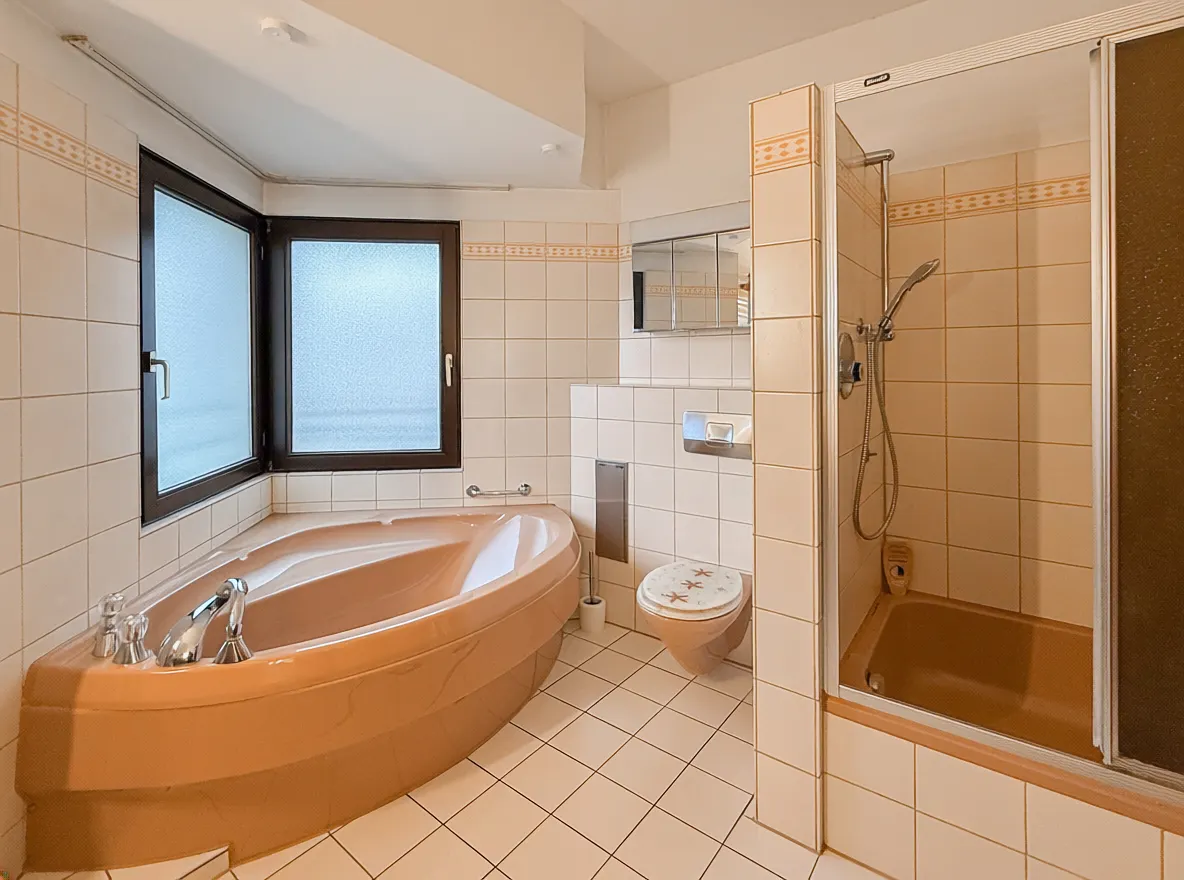 | Bad mit Dusche, Wanne, Fenster |