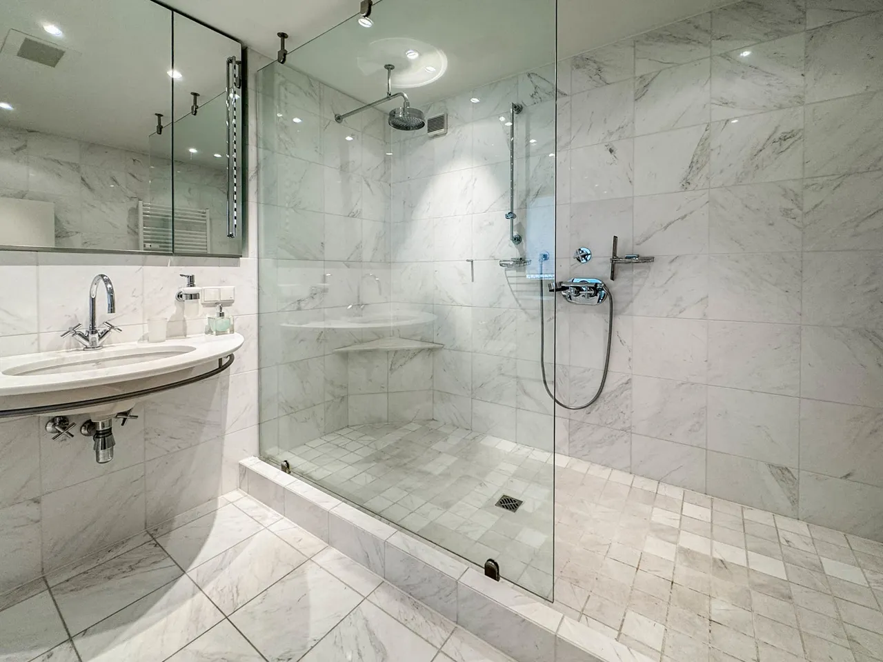 Der Schlafbereich mit einer weiteren Terrasse verfügt über ein modernes Luxusbad mit XXL-Dusche en Suite. Für Ihre Gäste findet sich ein separates WC im Eingangsbereich.
