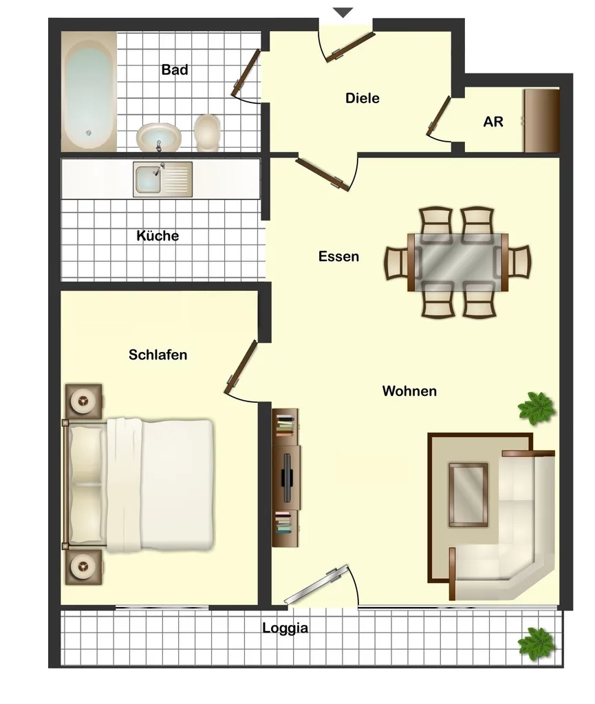Mittelpunkt der Wohnung ist der Wohn-/Essbereich mit angrenzender Loggia.